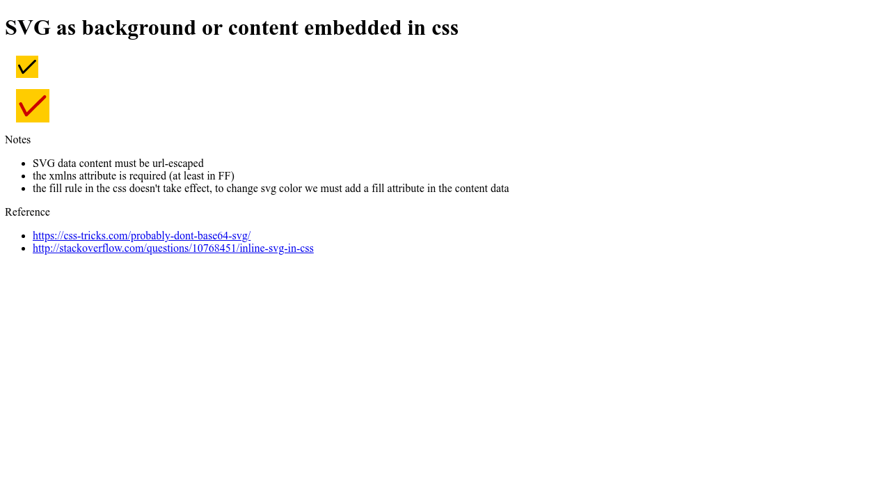 We do something similar in the JavaScript scenario as well:. All the time I use SVGs, I either place them completely in the HTML as follows:. The SVG remains hand editable in the style sheet.