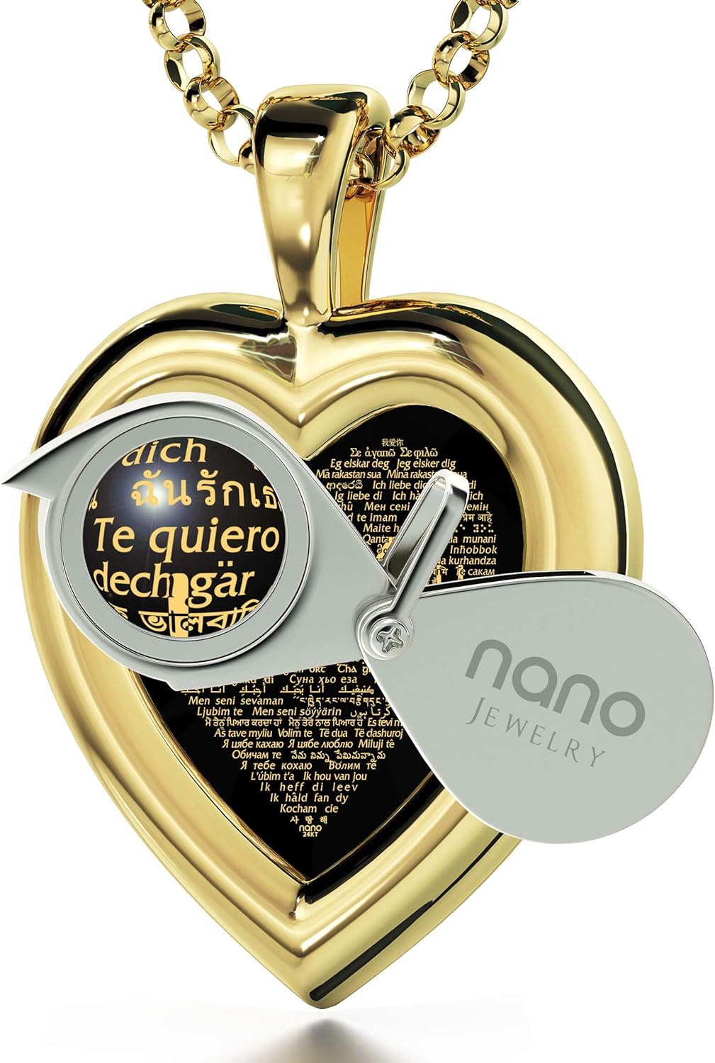Amazon Com Gold Plated Heart Pendant I Love You Necklace 24k Gold Inscribed In 1 Languages In Miniature Text On Brilliant Cut Heart Shaped Cubic Zirconia Gemstone 18 Rolo Chain Black Gold Plated Silver Jewelry