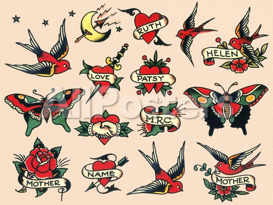 Hearts And Sparrows Authentic Vintage Tatooo Flash By Norman Collins Aka Sailor Jerry Posters Piddix Allposters Com