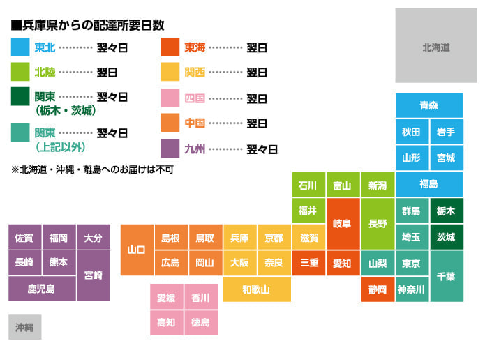 佐川急便/北海道、本州、九州、四国、淡路島、天草(大矢野島・上島・下島)の地域 郵便/沖縄、佐渡島を含む上記以外の離島 ※佐川急便の配送日数は下図をご覧ください。 離島 沖縄、佐渡島を含む上記以外の島 ⇒ 郵送 ※日時指定なし.