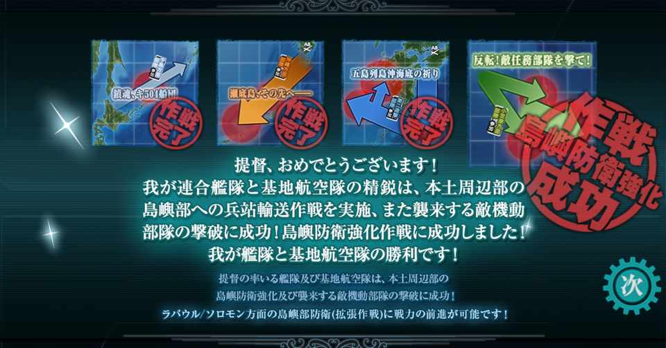 いよいよ夏イベラスト海域、拡張作戦E-4甲マラッカ海峡沖決戦となります。 初めにお断りしますが今回筆者は 「速吸なし. 夏?イベ 侵攻阻止!島嶼防衛強化作戦 e-4(反転!敵任務部隊を撃て!)ラスダン(終了:修正版) 3日前 夏?イベ 侵攻阻止!. 新任務群(10/16) →主力オブ主力、精強「十駆」出撃準備ヨシ! →主力オブ主力、縦横無尽ッ! →静かな海を護る「鯨」、動き出す! →精鋭「二七駆」、回避運動は気をつけて! →秋限定野分の大冒険! →最精鋭!主力オブ主力、演習開始! →演習ティータイム!.