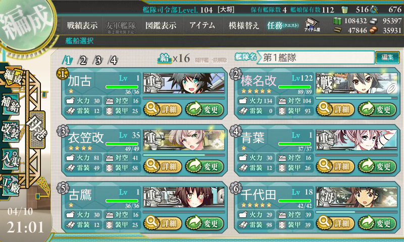 「第十六戦隊(第一次)」を編成せよ! 関連商品 安くて艦これしやすい ゲーミングマウス ロジクール G300s プログラム可能ボタン 左右対称. 秋イベント、終了しましたね。私は結局e5での嵐掘りに失敗しました。 気を取り直して新任務を消化しましょう。 a63「第十六戦隊(第二次)」を編成せよ! 「名取」を旗艦として、「五十鈴」「鬼怒」を擁する、第十六戦隊(第二次)を編成せよ !. 「第十六戦隊(第一次)出撃せよ!」をやってみました。 ※2期対応済みです。 出撃海域 出撃先は「2-2」でボスに1回s勝利で達成です。 編成は「足柄+球磨+長良+自由枠3」の構成で攻略します。 ※足柄は旗艦指定です。 編成 編成は「重巡1、軽巡2、駆逐2、水母1」でルートは「cek」。.