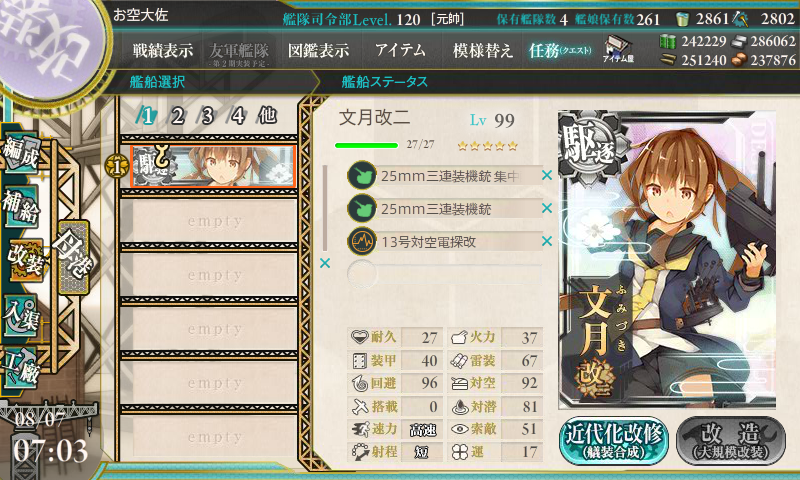 文月改二、皐月改二、水無月改、長月改を含む艦隊で任務攻略です。 精鋭「第二二駆逐隊」を再編成せよ! 精鋭. 満潮改二 のんびり練度を上げて改装。カワイイ。 文月改二 文月ちゃん改二のケッコンムービーを見たいので2隻目を改装。 鎮守府秋刀魚祭り スクショ前に5尾引き換えたので、今年の秋刀魚は60尾。全て改修資材に引き換え。 海防艦堀 最初は3-5と6-1を交互に周回してたけど、6-1は安定しなかっ. 今回は文月を改二に改造します。 改二画像のネタバレなどがあるのでご注意ください。 さすが睦月型 駆逐艦、改造費用が安いw.