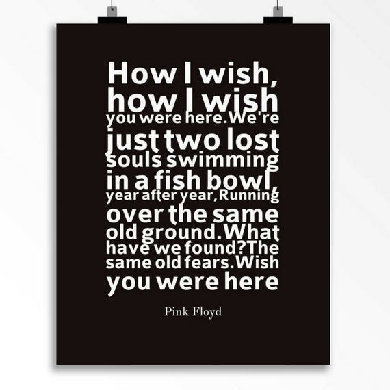 I tried to leave it all behind me / But I woke up and there they were beside me / And I don't believe it but I guess it's true / Some feelings, they can travel too. We're just two lost souls Swimming in a fish bowl Year after year Running over the same old ground. "Wish You Were Here" is the title track on Pink Floyd's 1975 album Wish You Were Here.