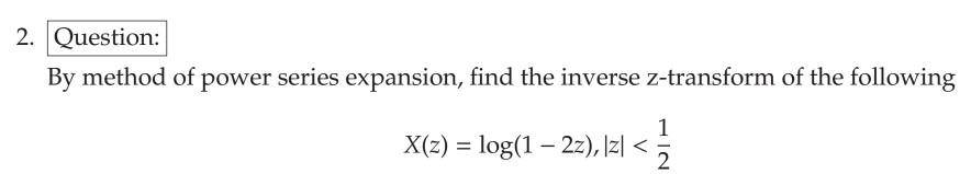 In a geometric series, every term has the same coefficient. You may remember from geometric series that for appropriate values of r.Similarly, this tells us from a power series perspective that when x is between -1 and 1. X1n = 0.3" un x2n = an -0.3 an-1 and x3n is obtained by convolving xin and x2n that is x3n = x1n * x2n * x2n a) Find the complex cepstrum, î;(n).