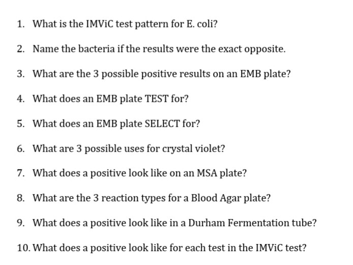 Microbio 225 Lab Test 3 Selective And Differential Media Imvic Biochem Tests With Some Bacterial Samples Flashcards Questions And Answers Quizlet