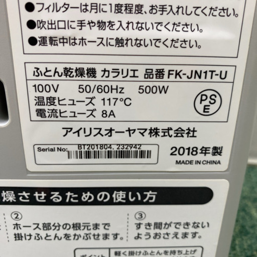 配達無料地域あり アイリスオーヤマ ふとん乾燥機カラリエ18年製 製造番号 Bt1804 バンビ 上新庄の家電の中古あげます 譲ります ジモティーで不用品の処分