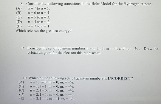 Of the following transitions in the Bohr hydrogen atom, the ____ transition results in the emission of the highest-energy photon. Join Yahoo Answers and get 100 points today. A neutral atom has two electrons with n = 1, eight electrons with n = 2, eight electrons with n = 3, and one electron with n = 4.