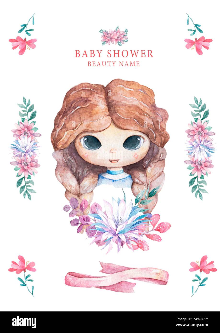Cute Romantic Cartoon Girl With Flowers And Floral Background Watercolor Adorable Hand Draw Illustration Colorful Art For Design Postcard Baby Stock Photo Alamy