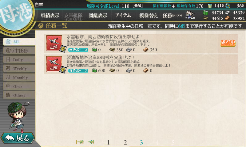 艦これ 7月17日 製油所地帯沿岸の哨戒を実施せよ 任務完了 艦これ日記 白羊の記録紙