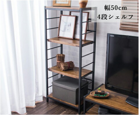 オープンシェルフ 4段 幅50 奥行30 高さ108cm 木製 棚板 アイアン スチール ブルックリンスタイル ブラック アンティーク調