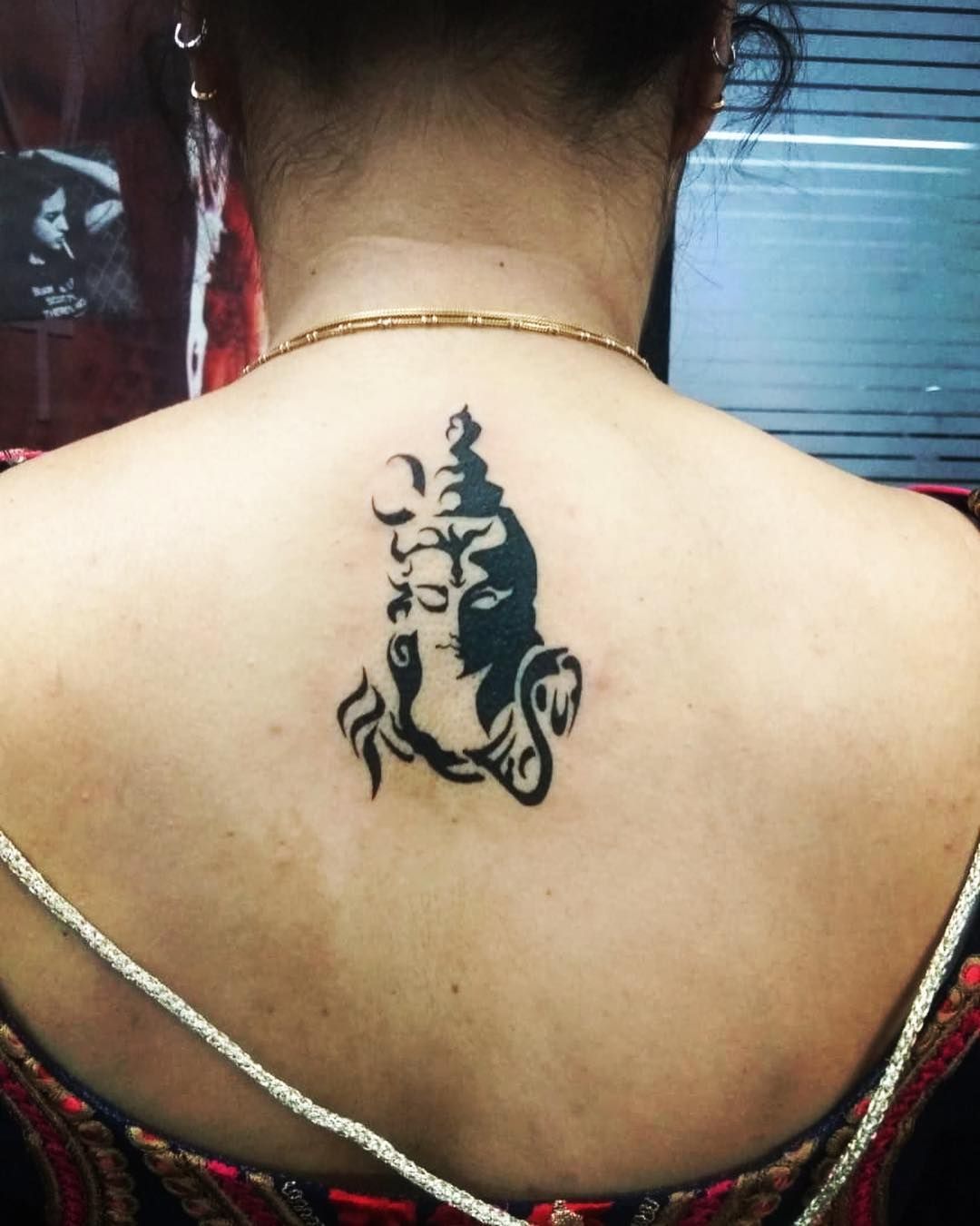 Om namah shivay tattoo design with Trishul on back. Another great design of a girl with tribal wear. He is the protector, the creator, the destroyer, He is often depicted in art and sculptures with a snake around his neck and holding his famous trident.