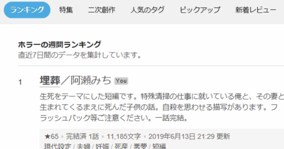 小説投稿サイトカクヨムでホラージャンル週間一位になった喜びをはじけさせる 阿瀬みち Note