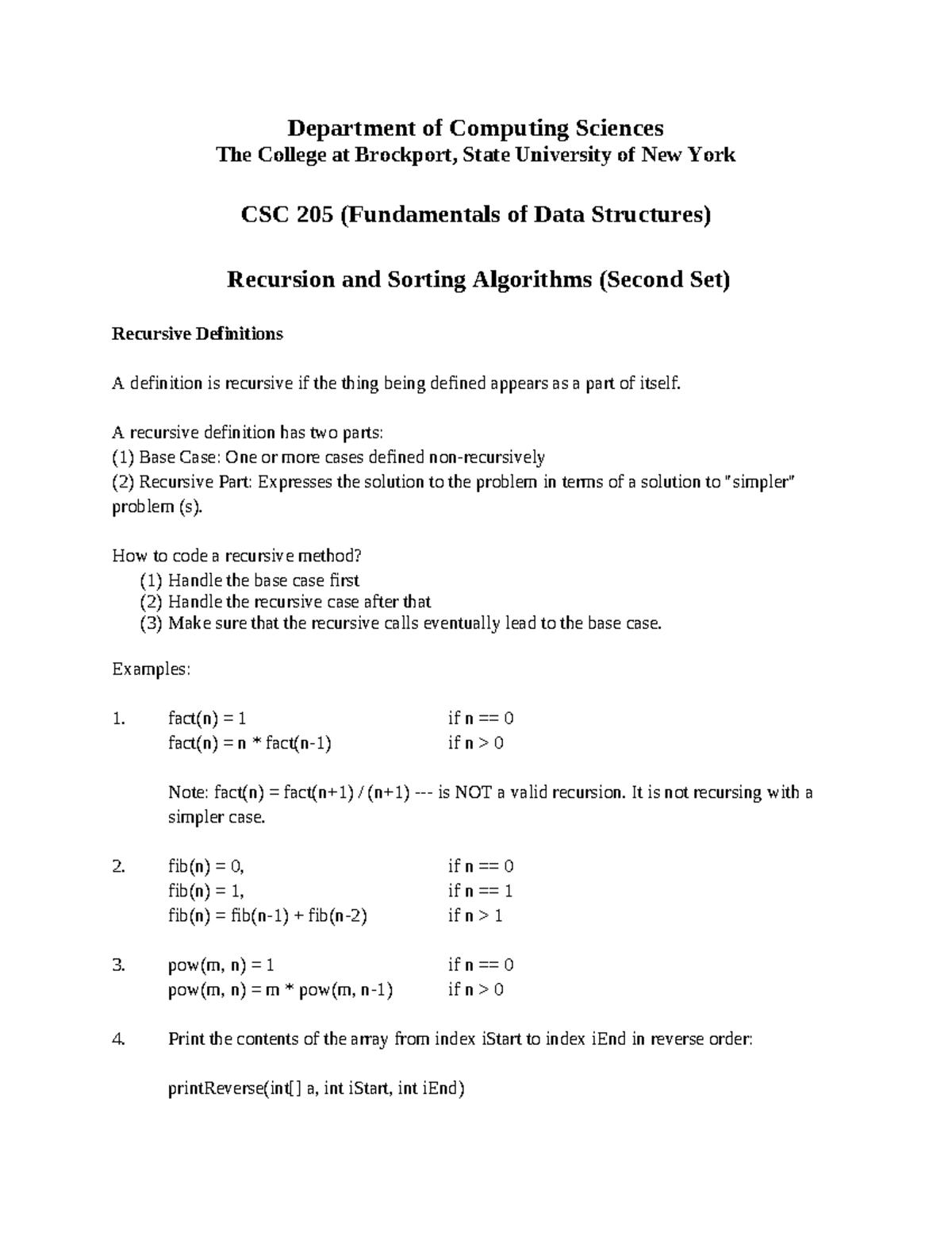 6 Recursion And Sorting Algos 2 Fund Comp Sci Ii Studocu